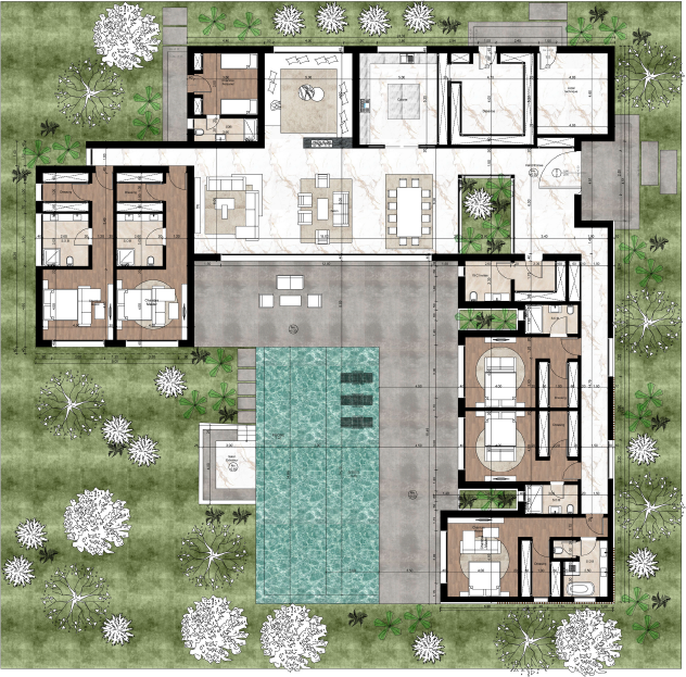 Le plan de la Villa AGDAL a été conçu pour maximiser les volumes, la circulation et la luminosité naturelle. La séparation claire entre les espaces de réception et les espaces nuit garantit intimité et confort au quotidien. Chaque mètre carré est exploité de manière fluide et fonctionnelle, permettant une expérience de vie harmonieuse, aussi bien pour une résidence principale que pour une maison de villégiature haut de gamme.