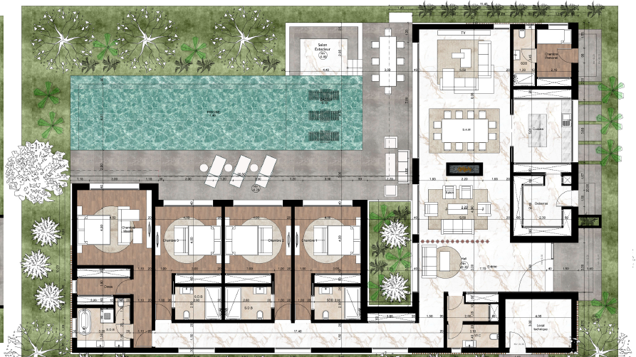 Le plan de la Villa Palmeraie allie confort, luminosité et intimité grâce à une organisation fonctionnelle :
